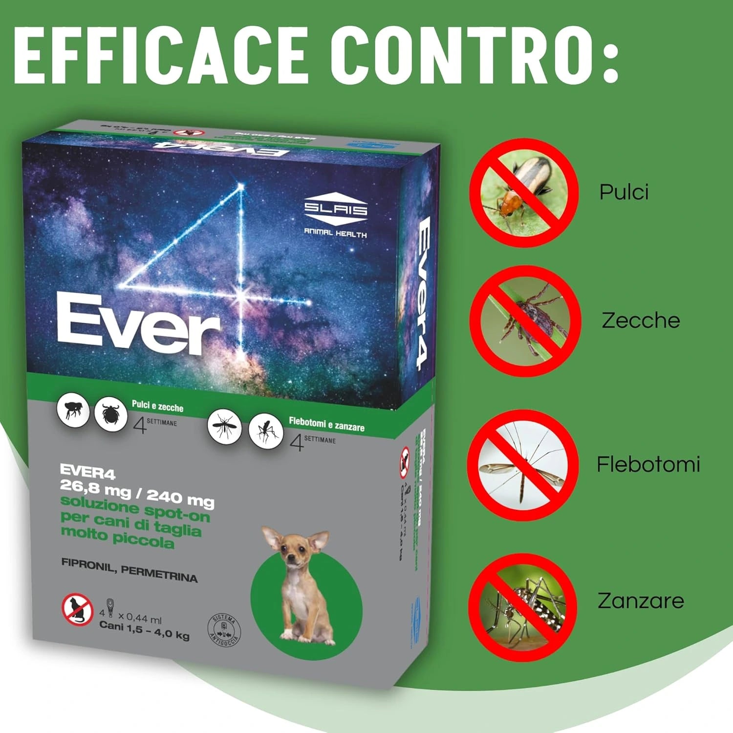 Slais Ever 4 Spot On è un antiparassitario per cani di taglia molto piccola (1,5-4 kg) che offre protezione completa contro pulci, zecche, zanzare e flebotomi. Agisce rapidamente uccidendo le pulci entro 24 ore e previene nuove infestazioni per quattro settimane. La sua azione repellente (anti-puntura) aiuta a ridurre il rischio di trasmissione di malattie da parassiti.