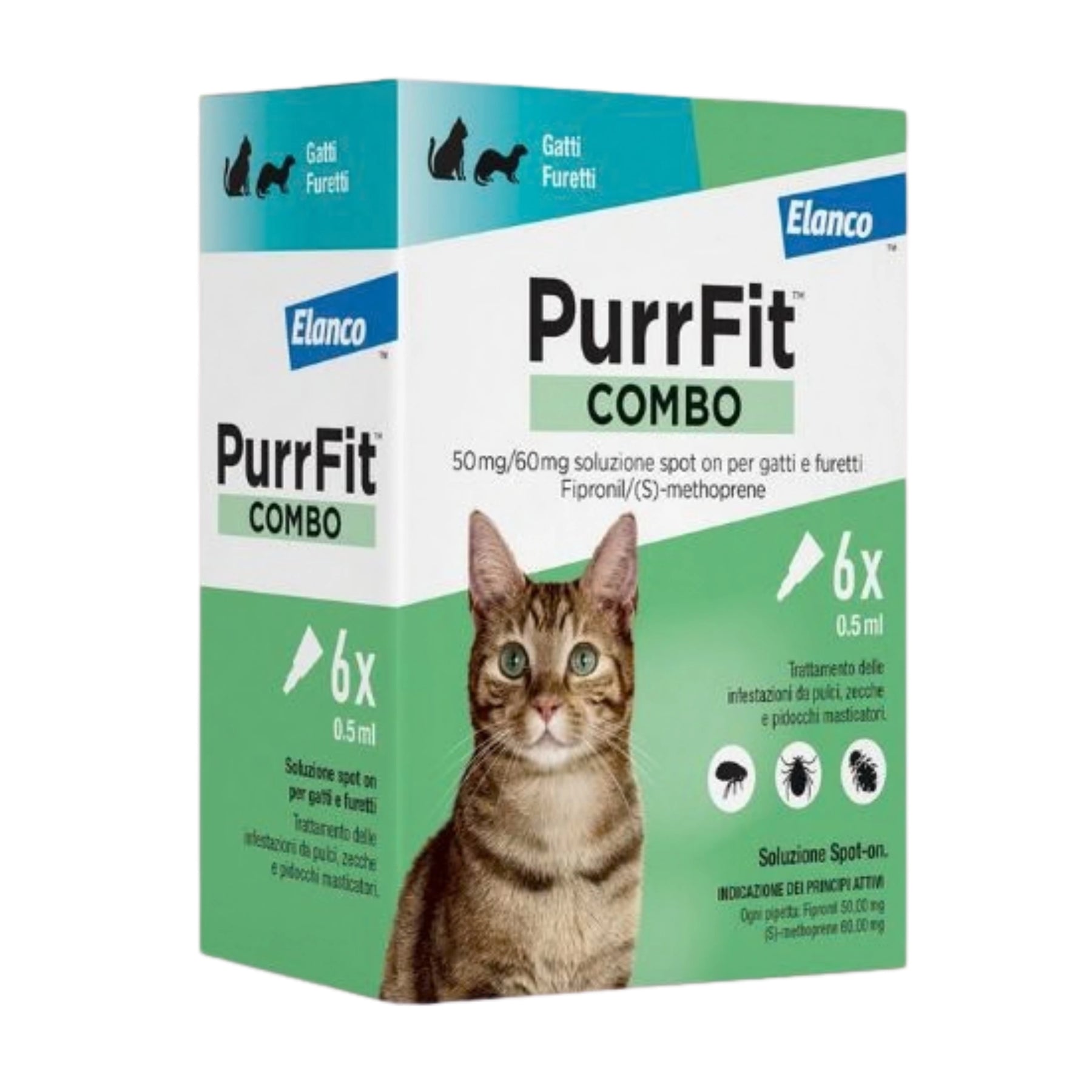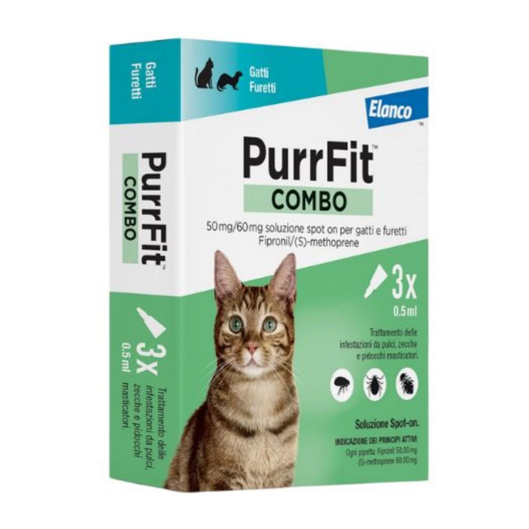 Purrfit Combo è un antiparassitario spot-on ad ampio spettro indicato per gatti e furetti, utile nel trattamento e nella prevenzione delle infestazioni da pulci, zecche e pidocchi masticatori. Grazie all’azione combinata dei suoi principi attivi, elimina i parassiti adulti e blocca lo sviluppo di uova, larve e pupe, interrompendo il ciclo vitale delle pulci. È indicato anche come supporto nel controllo della Dermatite Allergica da Pulce (DAP).